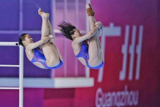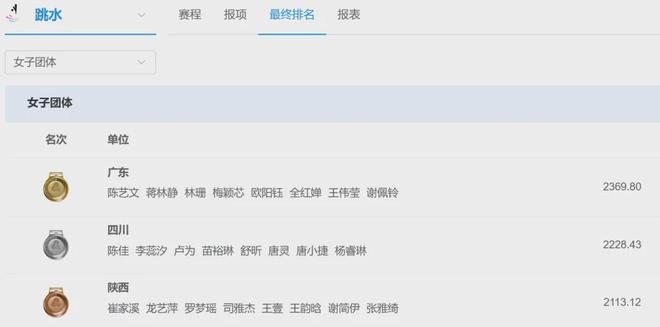 今天(11月2日) 第十五届全国运动会 跳水项目 在广州开启首个比赛日 今天是跳水女子团体比赛 两位奥运冠军 陈艺文、全红婵压阵的 广东队 在女团四个项目均拿下第一 最终总分2369.8 拿下 跳水女子团体金牌! 这是十五运会跳水项目 诞生的首枚金牌 四川队获得亚军 陕西队获得季军