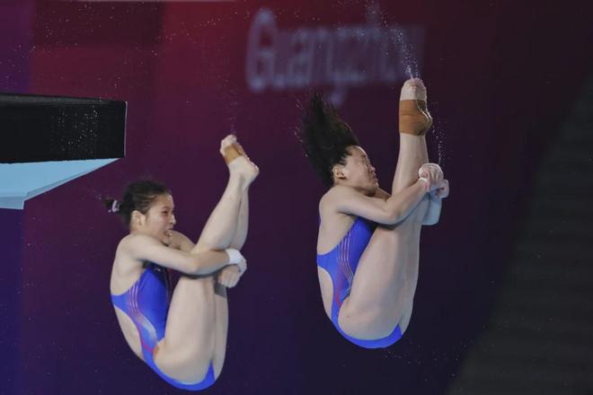 梅颖芯/欧阳钰在比赛中。 女团单人10米台 广东队 王伟莹、谢佩铃 分别拿下第一名、第三名