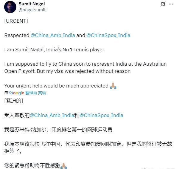 印度网球选手前往中国参赛遭拒签,社媒求助中国驻印度大使馆