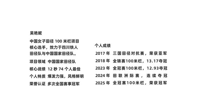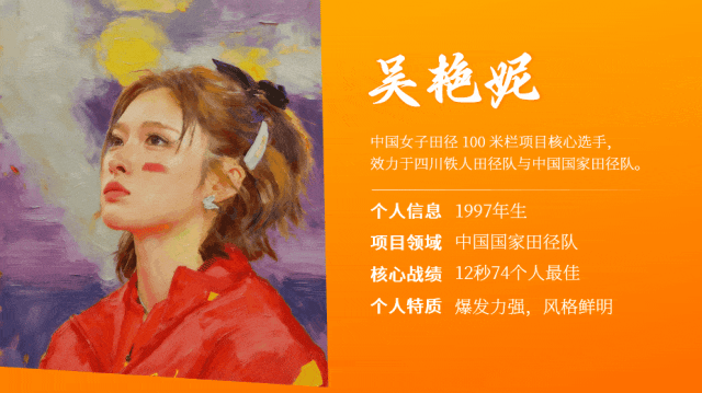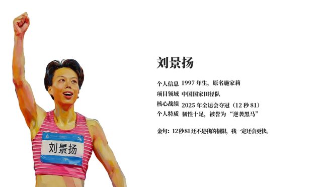 而名不见经传的刘景扬则逆袭夺冠,成为了赛场黑马! 有人为“跨栏女王”的惜败惋惜,也有人为“黑马”的逆袭喝彩 今天我们就为这两位优秀运动员做了一份人物介绍 PPT,带你一键解锁她们的硬核人生!