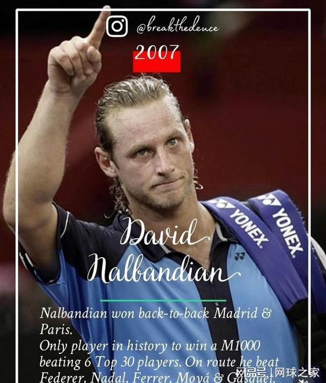 2012的费雷尔:这是西班牙球员中第一座巴黎大师赛冠军奖杯,也是迄今为止唯一一个。很难相信吧!纳达尔和阿卡携手迄今为止这件事还没办到! 2008的特松加:当年澳网获得亚军的法国阿里,将这一年的好状态延续到了年底。这也是自2001年以来诞生的首个本土冠军,特松加在夺冠路途中先后击败了德约科维奇、罗迪克、纳尔班迪安(卫冕冠军)以及布雷克。 2007年的纳尔班迪安:这是大师赛历史上唯一一个一届赛事能击败6位世界前30的球员,一路上他击败了费德勒、纳达尔、费雷尔、莫亚、加斯奎特,含金量和当年他连克三巨头夺得马德里大师赛有得一比。