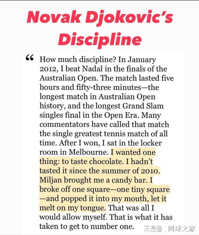 德约科维奇在夺得那场载入史册的澳网冠军后,他的庆祝方式,成为了比冠军本身更令人震撼的注脚。那不是一个放纵的夜晚,而是一个极致克制的瞬间。他品尝了自2010年夏以来未曾碰过的巧克力作为奖赏,但那奖赏的分量,微小到仅仅是仪式性的存在。 这个故事的核心,早已超越了饮食控制本身。它揭示了一个顶尖运动员,乃至任何一个领域巅峰人物的核心特质:自律的本质,不是苦行,而是清醒的选择。是为一个宏大、清晰的目标,主动、持续地放弃那些与目标无关的、即时性的满足。