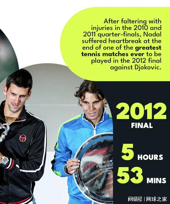 2012 年1月,德约科维奇在澳网决赛击败了纳达尔。这场比赛持续了5小时53分钟,这是澳网史上最长的一场比赛,也是公开赛年代以来耗时最长的大满贯单打决赛。许多评论员称那场比赛是史上最伟大的单场网球比赛。