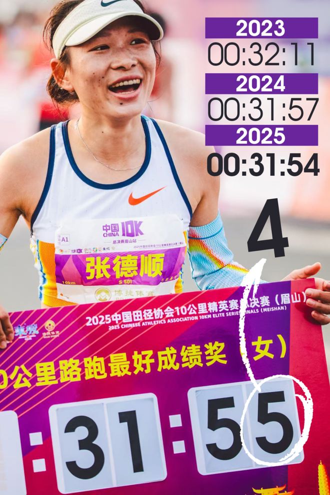 眉山,是中国路跑的纪录之地。在过去两年,眉山仁寿见证了中国国家半马男女最好成绩的诞生。而在2025年年末,张德顺在眉山举办的中国10K总决赛上将自己保持的10公里最好成绩刷新到31:54,比2024年在安徽芜湖创造的31:57快了3秒。 紧随其后的李美珍获得亚军,虽然遗憾没能跑进32分,但这个成绩仍是她10公里的最好成绩。与她一同PB的还有在上马获得国内亚军的吴冰,在全运会3000米障碍拿到第四名、师从肖丽的杨屹婷。 12月28日早上9时,2025中国10K总决赛眉山站在眉山城市新中心体育公园鸣枪开跑。这场年度收官之战高手云集,女子阵容里不仅有“一姐”张德顺、今年全马跑到227,在全运拿到马拉松第四名的李美珍、上半年10K成绩位列亚洲女子第一的刘敏、亚锦赛马拉松冠军江苏选手吴冰,还有今年首马即跑出229的黑马郑小倩、大众一姐黄雪梅等;男子则吸引了毛金虎、徐国歌等同场,董国建、杨绍辉、丰配友、奚枭横等名将对决。 起跑前,温度8度,湿度75%,虽然略有点冷,但整体气温不错,加上眉山平整开阔的赛道,非常适合跑成绩。 发枪后,张德顺、李美珍、刘敏、吴冰、郑小倩、杨屹婷等女选手组成第一集团在男选手的破风下开跑。2公里后,张德顺、李美珍和刘敏稳定在领先集团,且三人前后咬得特别紧,其余选手则掉至追逐集团。男子方面,丰配友跟在Pacer之后,毛金虎和蒋发坤紧跟其后。
