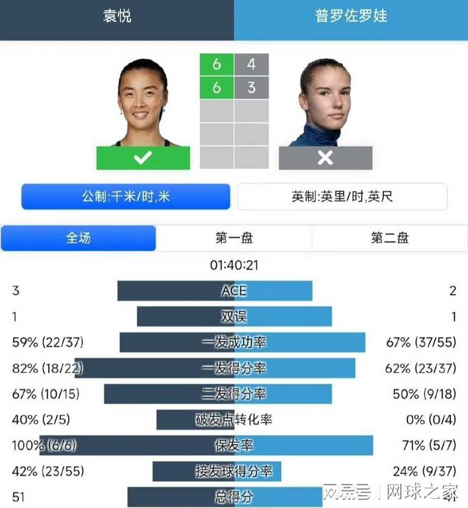 整场比赛,袁悦的战术执行相当明确。面对普罗佐罗娃强劲的一发,她采取了稳固防守的策略,将球回到对手反手位深区。当对手二发时,袁悦则积极抢攻,特别是针对普罗佐罗娃偏弱的中路二发,多次直接打出制胜分。数据显示,袁悦本场比赛的一发成功率高达78%,一发得分率达到70%,这两项数据相比她之前比赛中的表现有显著提升。 赛后技术统计,袁悦在发球稳定和关键分把握上表现非常不错,她全场发出了4记Ace球,没有出现双误,这与她在澳网比赛中二发得分率仅47%的表现形成鲜明对比。袁悦在破发点把握上效率惊人。她全场共获得五个破发机会,成功兑现四个,破发成功率高达80%。而普罗佐罗娃虽然获得了七个破发点,但只成功破发一次。