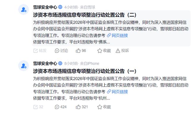 1月19日,雪球“大V”金永荣因操纵证券市场,被浙江证监局合计罚没超8300万元,并被采取3年证券市场禁入措施。 监管处罚发出后,雪球平台开展了整治资本市场违规信息的专项行动。1月20日,雪球先后发布两份《涉资本市场违规信息专项整治行动处置公告》,对相关违规账号进行封禁。 雪球封禁违规账号 有“大V”称遗憾 诱导跟风、小作文、非法证券投资咨询、违规导流……资本市场乱象频发。为妥善解决上述问题,雪球平台开展了专项整治行动。 1月20日,雪球平台发布了两则专项整治行动处置公告,对多位平台“大V”进行封禁。 在两份公告中,雪球对违规账号“杭州新城路”“轮回666”“福禄娃爷爷”“佛系万梅作手”“武汉刘青正”“郑州复兴路”“主线龙”“花花牛2016”“阿呜呜一大口”“铭鑫稳盈”“宇中追枫实盘”作出永久封禁处置。