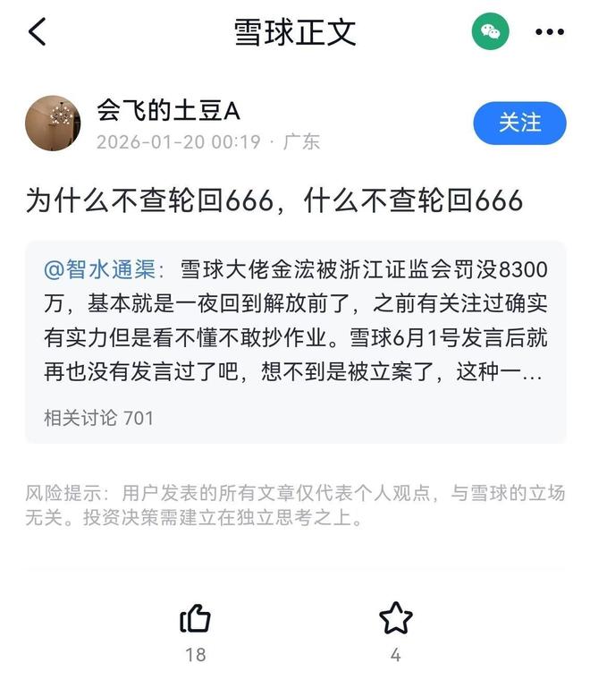 在“轮回666”之外,诸如“福禄娃爷爷”等的操作手法此前亦在雪球平台上有着广泛讨论,有质疑者认为其存在割韭菜行为。 在平台用户之外,此次封禁的账号拥有人也有表态。“轮回666”拥有人在今日于公众号“轮回666的一亩三分地”发布了名为“遗憾”的文章表示,“混进网络十余年,终有一日挥挥手”。