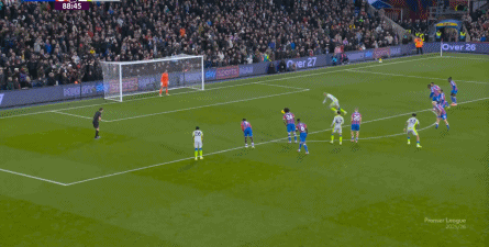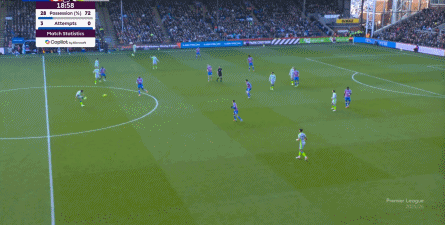 这使得水晶宫错过了他们的最好的战机窗口,因为体能问题即将找上门来,于是在此之后,水晶宫再无快速反击和进攻的机会,反倒是曼城,通过贝尔纳多-席尔瓦的牵制,暴露出了右侧禁区角的空间,找到了中场出身的努内斯,为后点的哈兰德送上了传中: