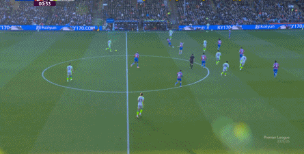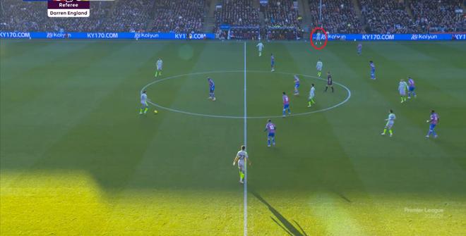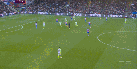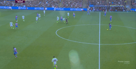 这一次进攻虽然没有打好,但确实为曼城指出了一条进攻通道,没有多库的边路突破,曼城倒也可以用传切试试进攻肋部。 但在大力挖掘这里的机会之前,他们首先需要顶住水晶宫的进攻。 本赛季,打进欧战的水晶宫饱受二线作战之苦,俱乐部并没有在夏窗大力投入,这使得格拉斯纳在争取进入欧协联淘汰赛的情况下,还要保住主力球员在英超的出勤率,这一点截至目前都没有受到明显影响。 周中客胜爱尔兰球队,此役继续近乎全主力,这已经是很不错的双线轮换能力了。 不过,人还在,精力不可能和上赛季类似,所以哪怕在主场,水晶宫依然保守应对,直至第10分钟,采用连续争高球的方式打进了禁区: